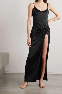 SKIMS Ruched Stretch-Silk Slip Dress – Soot – Slipdress Aus Stretch-Seide Mit Raffung ,Schwarz