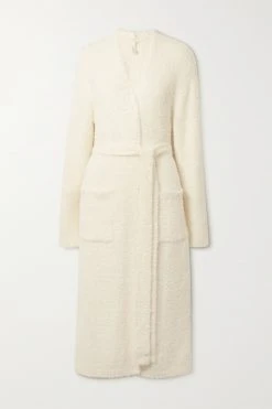 Kim Kardashian West, Gründerin von SKIMS, trägt diesen Morgenmantel auch gerne in Kombination mit dem passenden Tanktop und der dazugehörigen Hose. Das Modell besteht aus besonders weichem Bouclé, der elastisch sowie angenehm schwer ist, und hat einen abnehmbaren Bindegürtel. Es bietet zwei Taschen an der Vorderseite, die groß genug für ein Smartphone sind, und gefällt uns auch offen getragen ausgesprochen gut.
